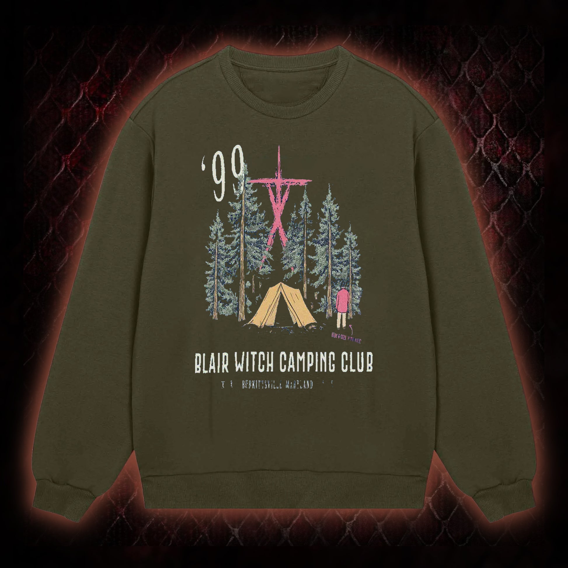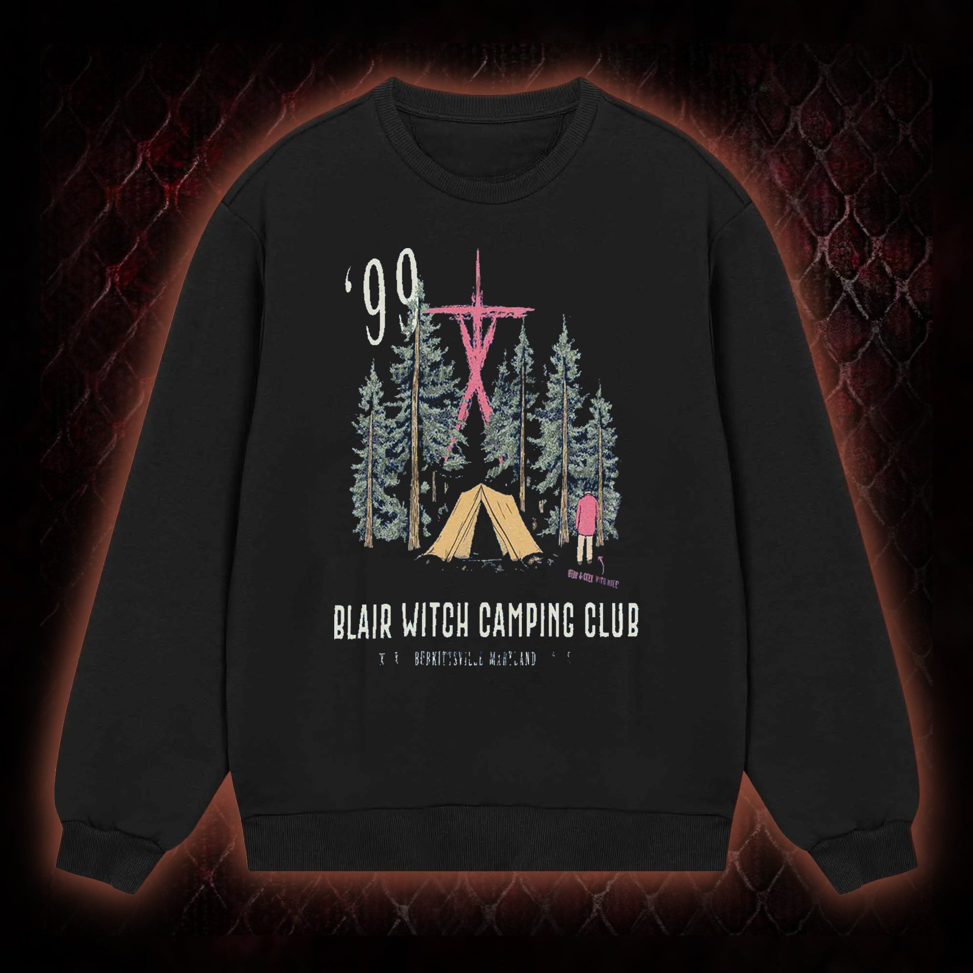 The graphic integrates core elements of the iconic 1999 found-footage horror film: the '¡¯99' year marker (aligning with the film¡¯s release), 'Blair Witch Camping Club' branding (tied to the film¡¯s central camping expedition premise), the setting¡¯s signature forest backdrop, and the film¡¯s eerie symbolic iconography. It also references 'Burkittsville, Maryland' (the film¡¯s fictional horror locale), authentically honoring the franchise¡¯s foundational found-footage horror aesthetic.