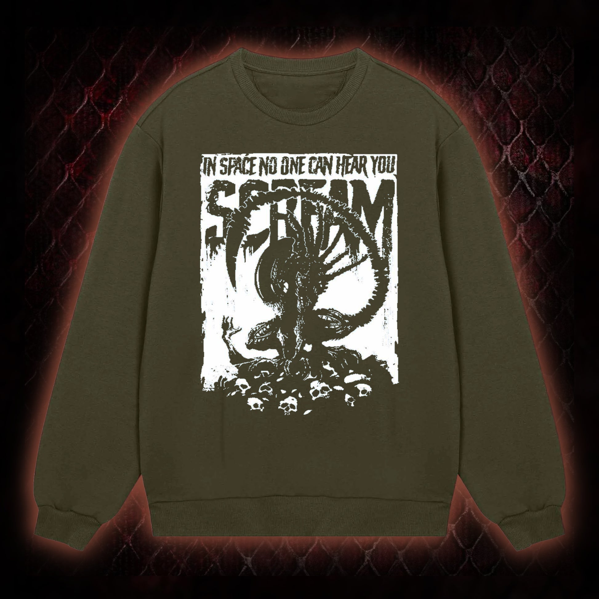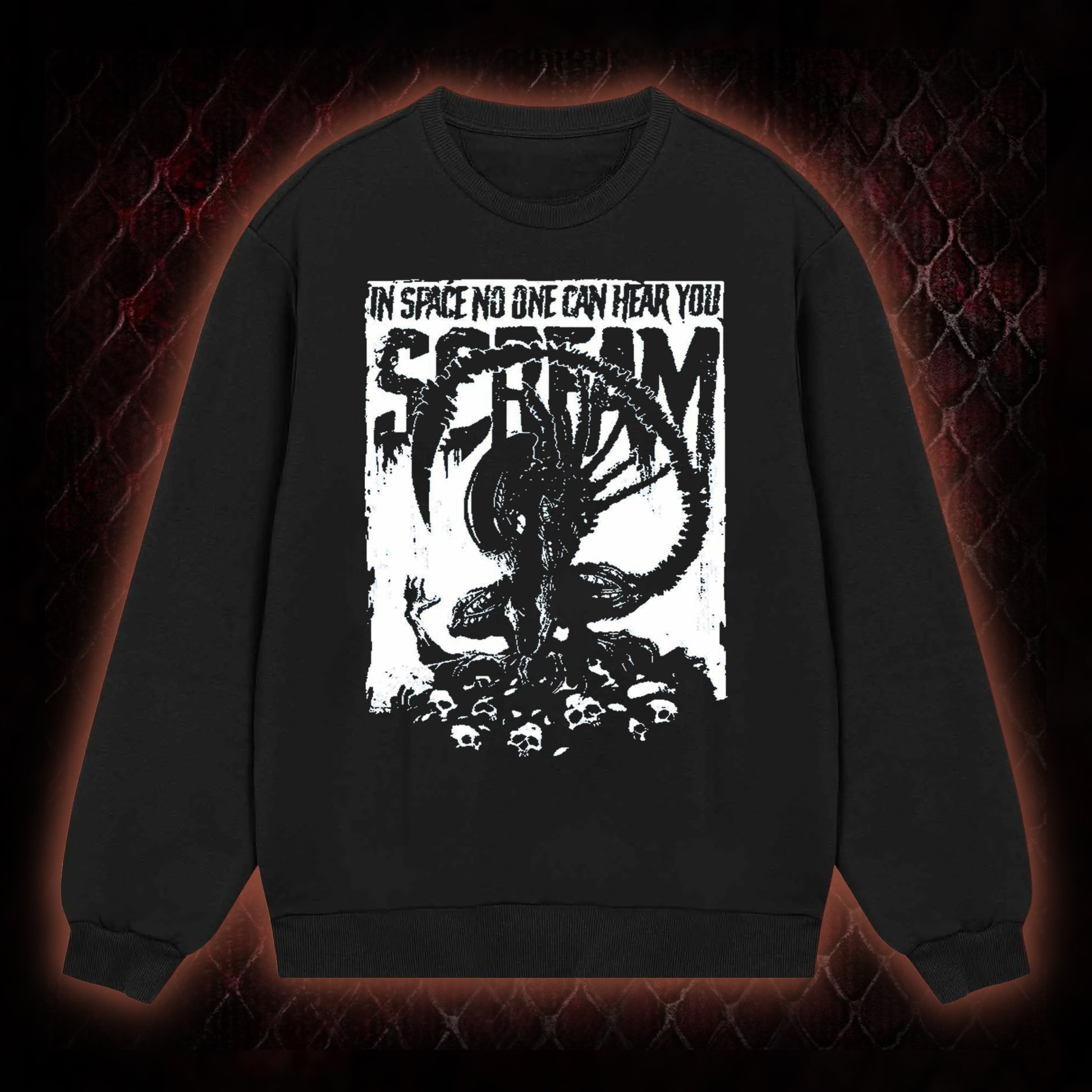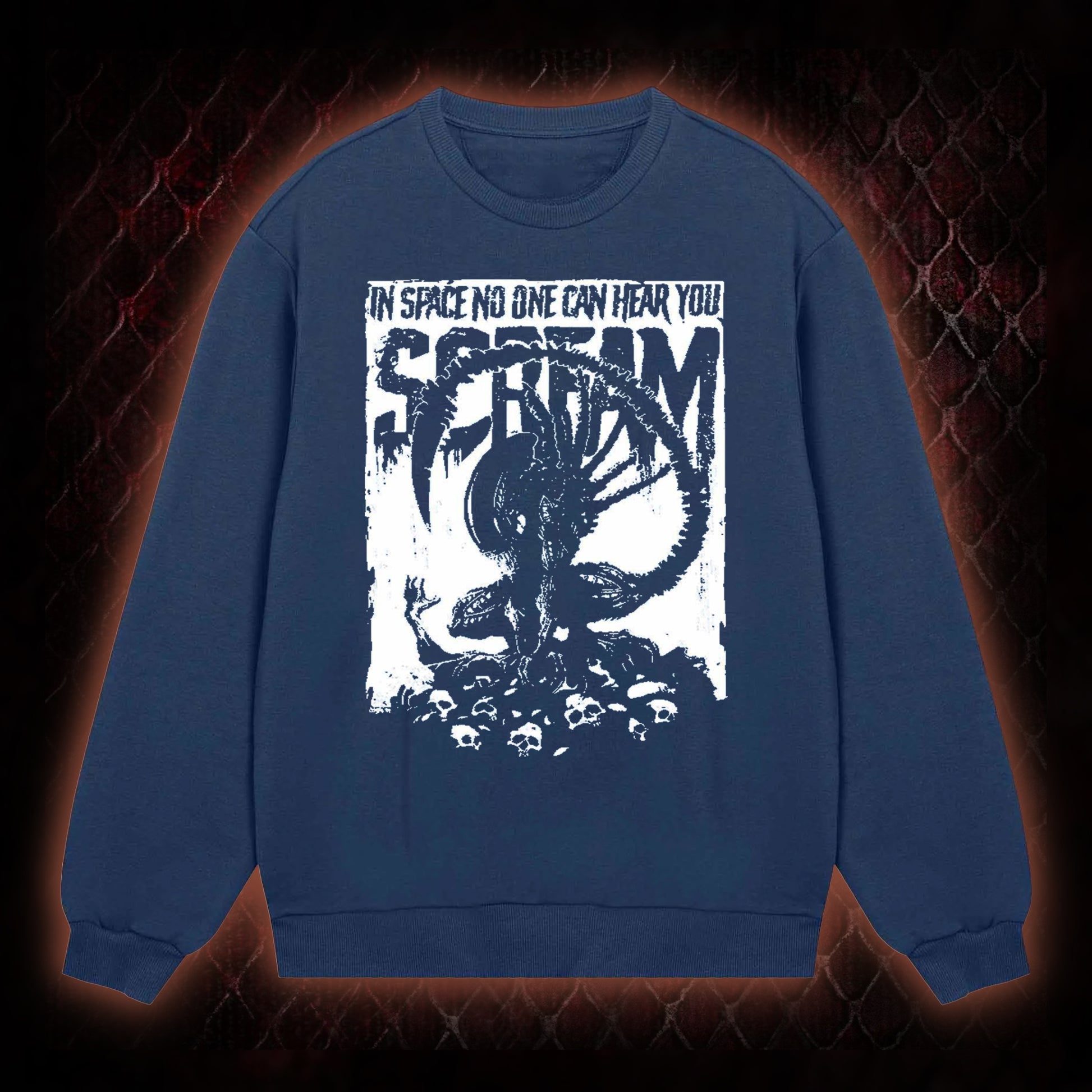The graphic features the Alien series' signature tagline 'In Space No One Can Hear You Scream' paired with a detailed illustration of the franchise's iconic Xenomorph creature (surrounded by skull motifs, aligning with the series' gory, tense aesthetic). This design honors the 1979 film's status as a foundational work of sci-fi horror, appealing to long-time Alien fans.