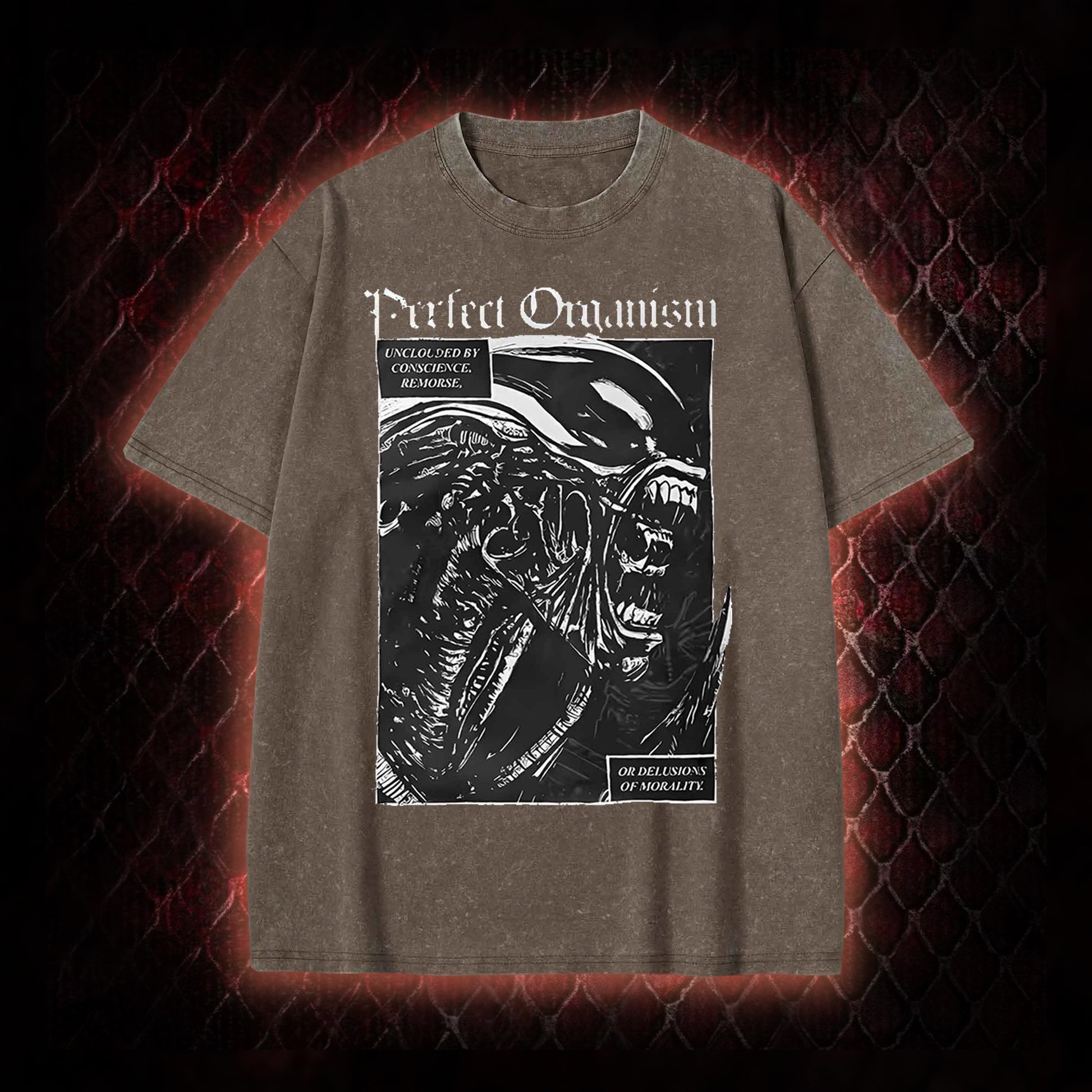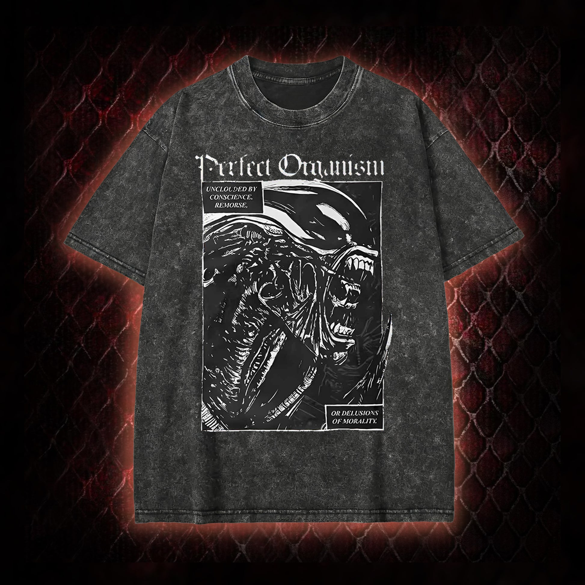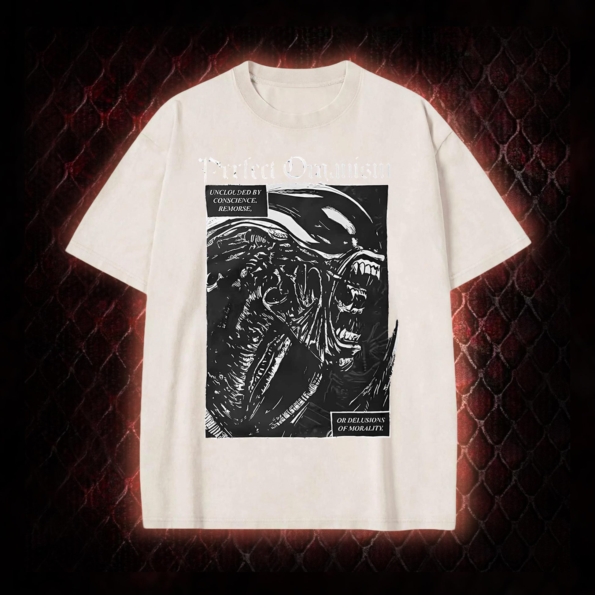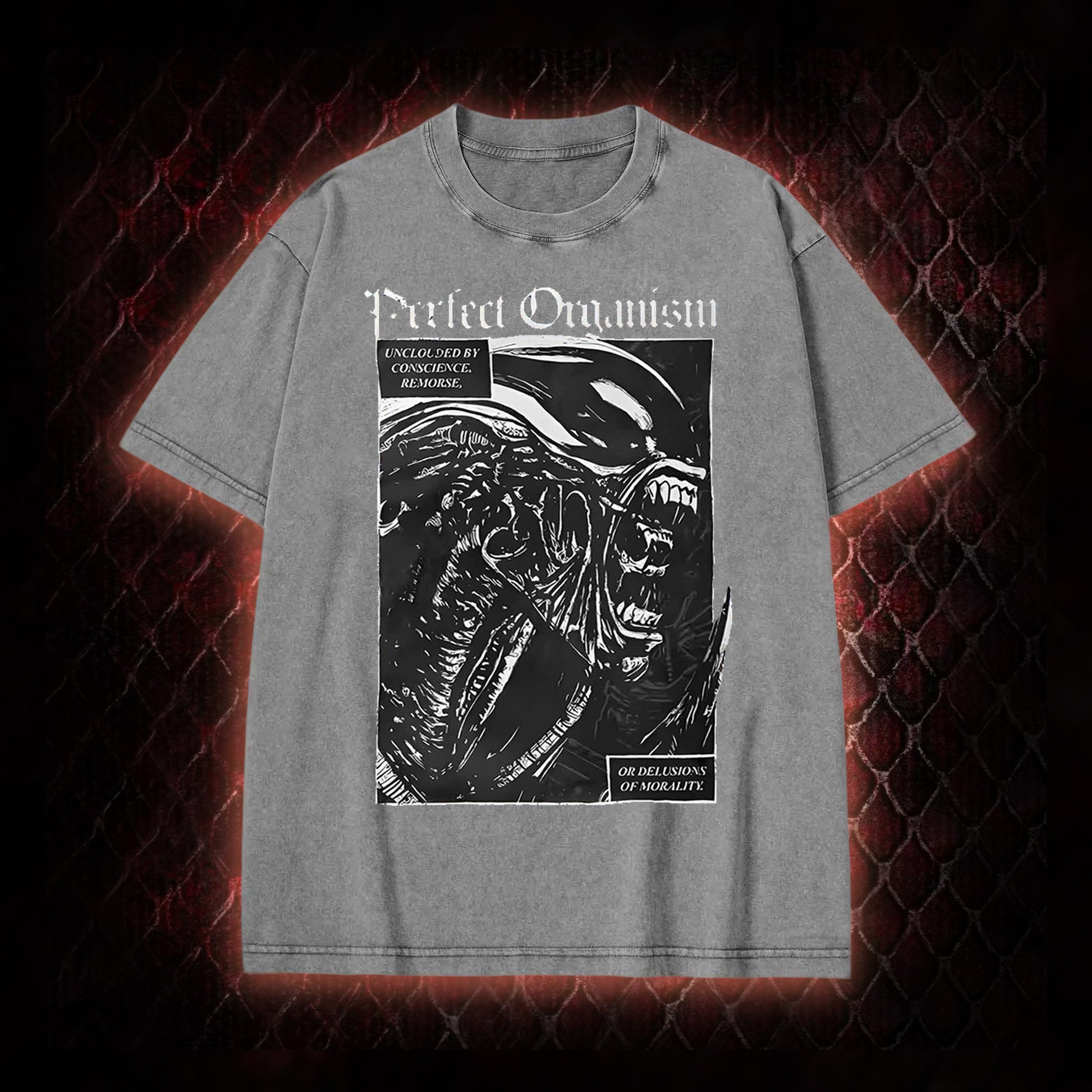 The graphic centers on the Alien franchise's iconic Xenomorph: it features the creature's signature menacing silhouette, paired with the film's defining description of the Xenomorph as a 'Perfect Organism' (a line from Alien that frames it as an unburdened, efficient predatory lifeform) and the accompanying text 'UNBECLOUDED BY CONSCIENCE, REMORSE, OR DELUSIONS OF MORALITY' (reinforcing the Xenomorph's status as a chilling, amoral sci-fi horror antagonist). This design honors the franchise's core horror premise and the Xenomorph's legacy as a pop culture icon.