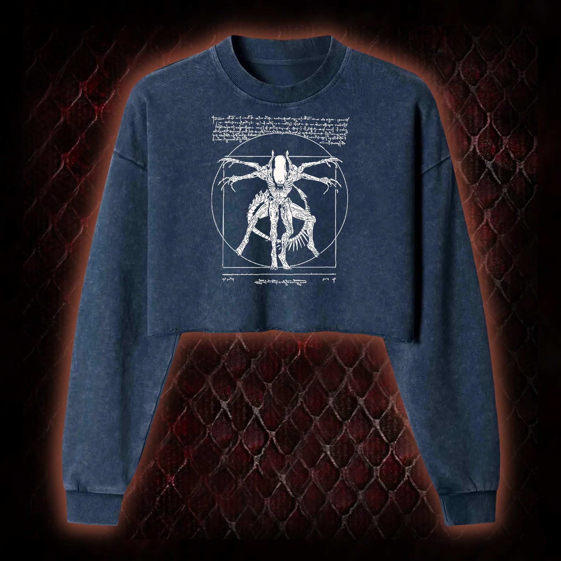 Alien Vitruvian Creature Graphic Shirt Cropped Long-Sleeved - Sci-Fi Horror Icon Tribute Piece