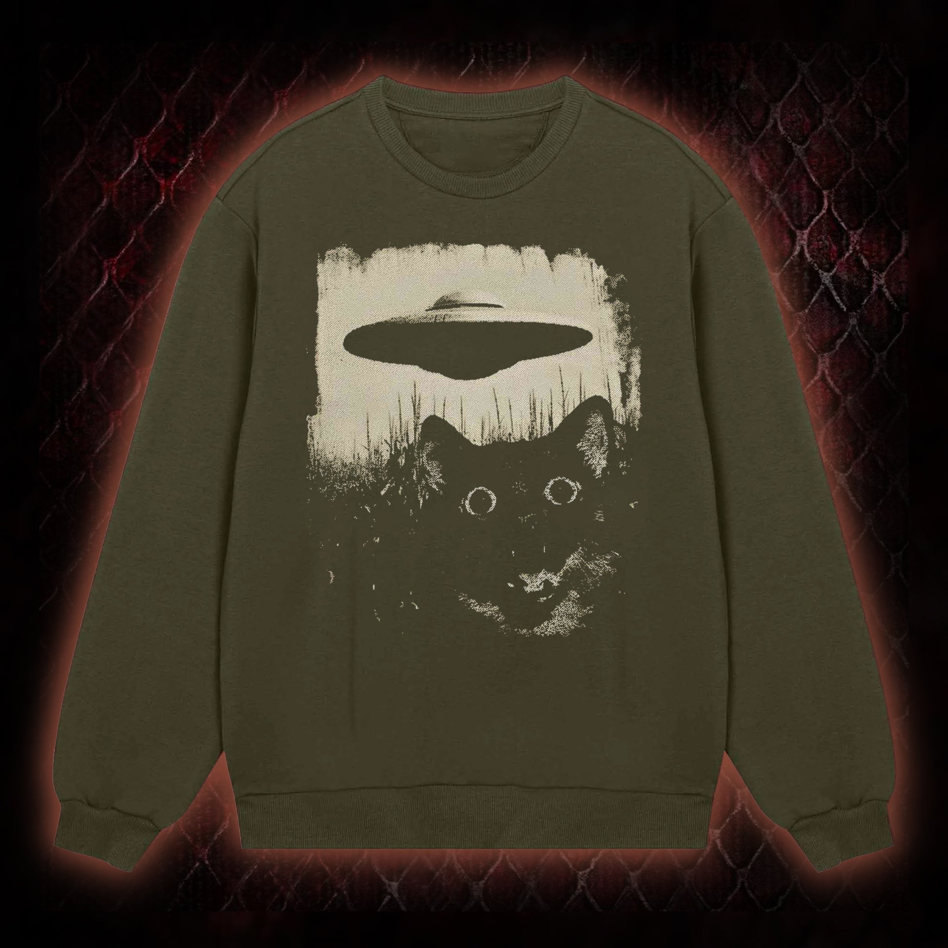 The pattern combines two iconic elements of weird fiction: a black cat (a staple symbol in horror/mystery culture, rendered here with eerie wide eyes) and a UFO (a core motif of cryptid/paranormal subcultures). The retro, distressed visual style aligns with vintage horror aesthetics, appealing to fans of weird fiction, cryptid lore, and retro genre media.