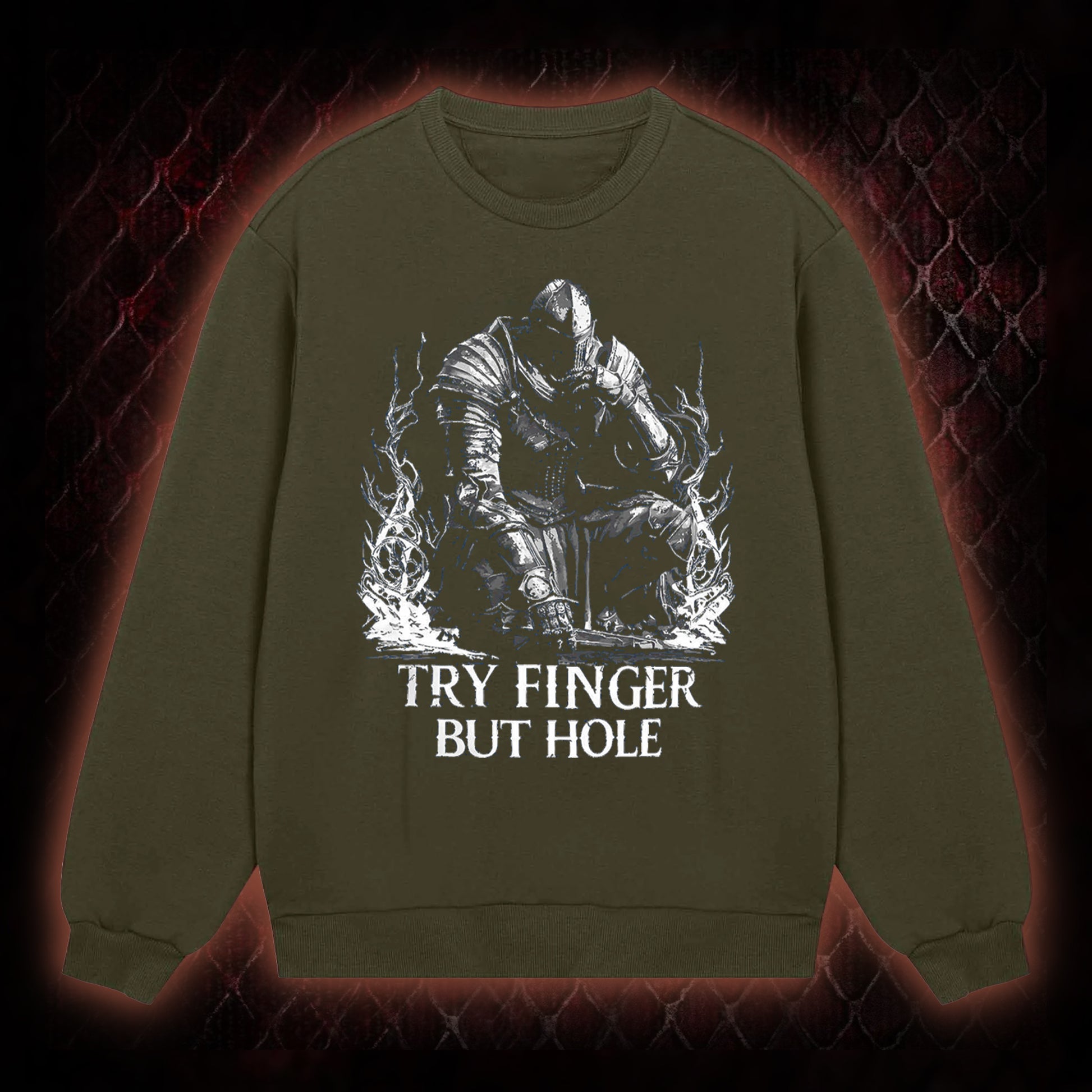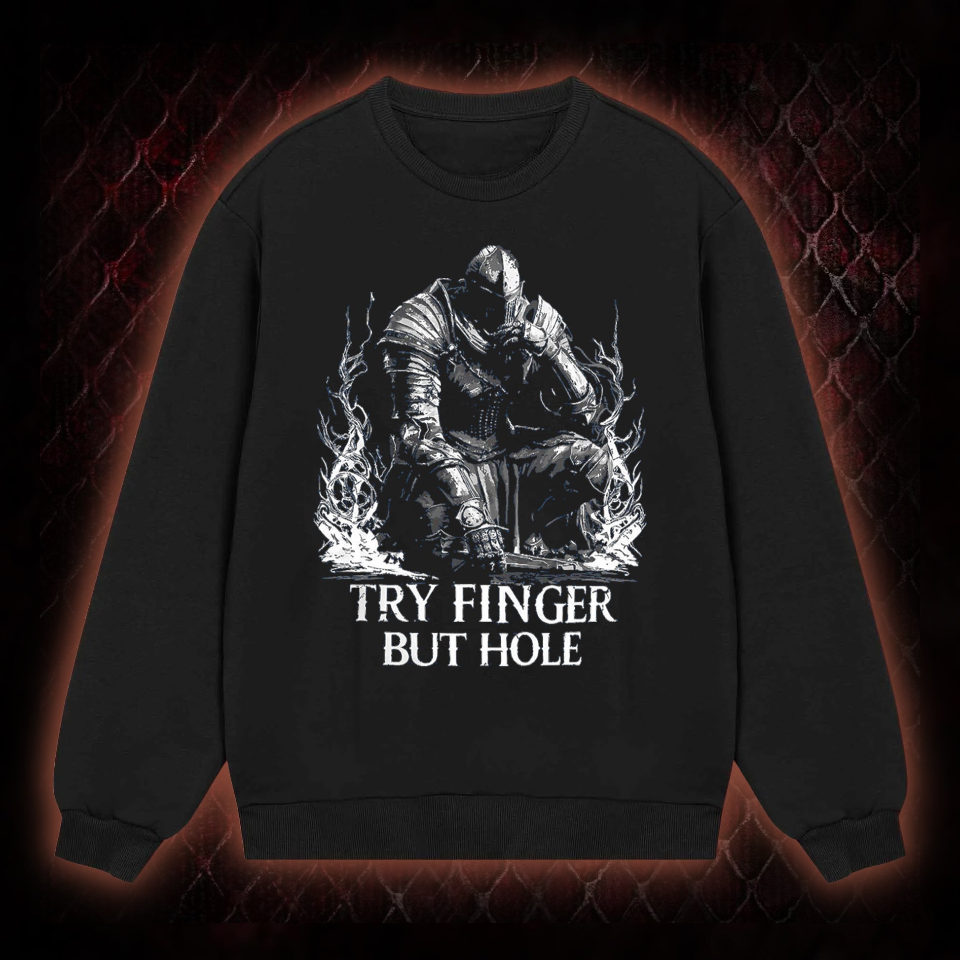The graphic features a knight figure (aligned with Elden Ring's armored character aesthetic) paired with the viral fan-favorite line 'TRY FINGER BUT HOLE'¡ªa humorous reference to the game's NPC Fia's iconic interaction option (a playful, intentionally awkward phrasing that became a staple meme in the Elden Ring community). This design caters to fans of the game's quirky lore and player humor.