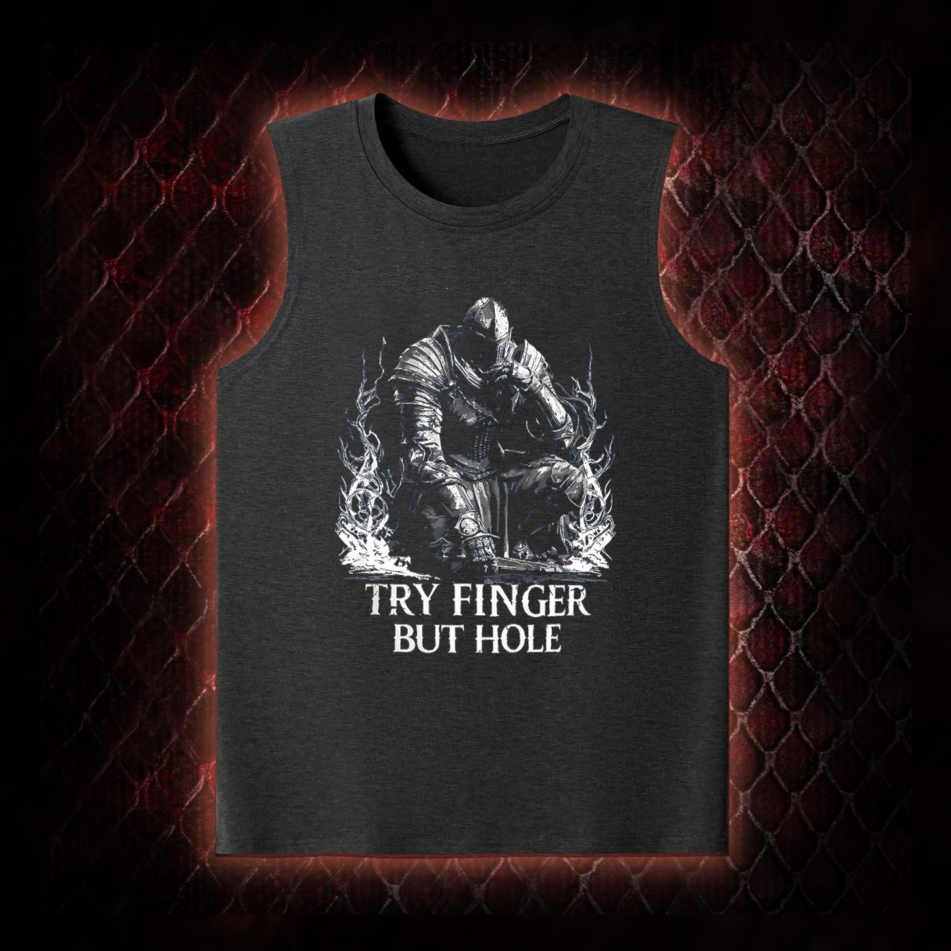 The graphic features a knight figure (aligned with Elden Ring's armored character aesthetic) paired with the viral fan-favorite line 'TRY FINGER BUT HOLE'¡ªa humorous reference to the game's NPC Fia's iconic interaction option (a playful, intentionally awkward phrasing that became a staple meme in the Elden Ring community). This design caters to fans of the game's quirky lore and player humor.