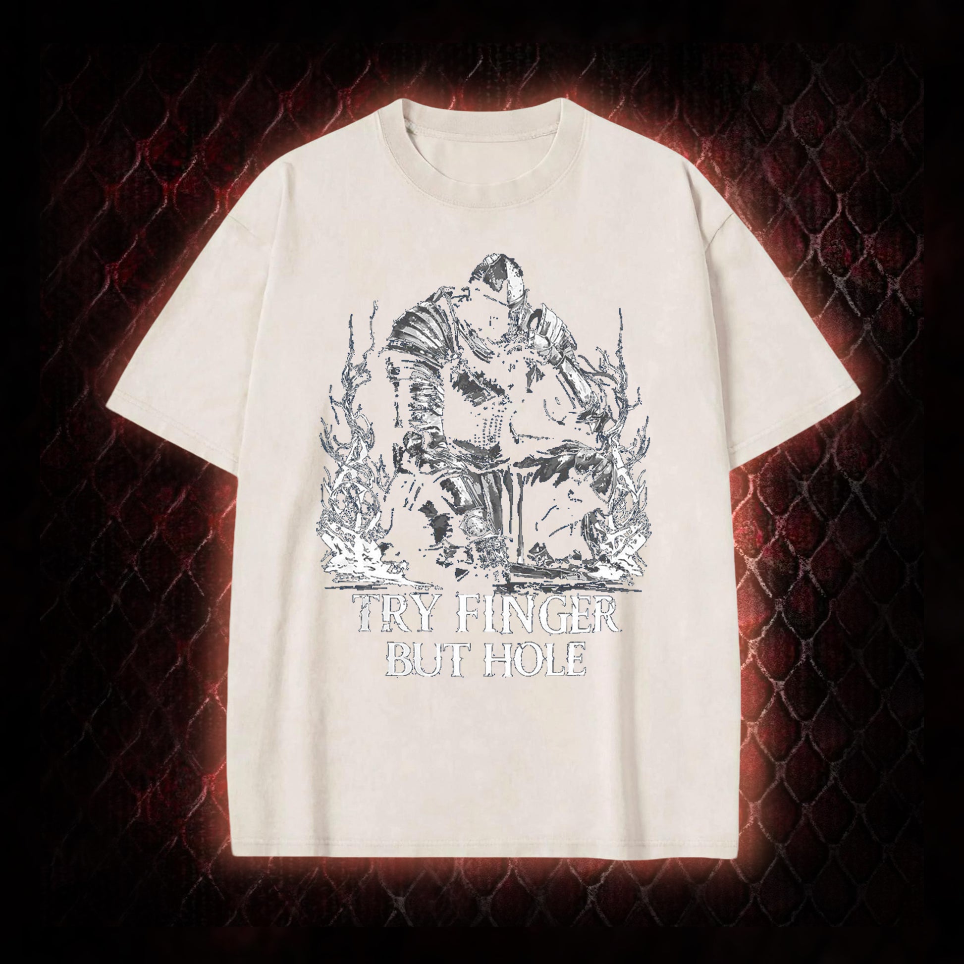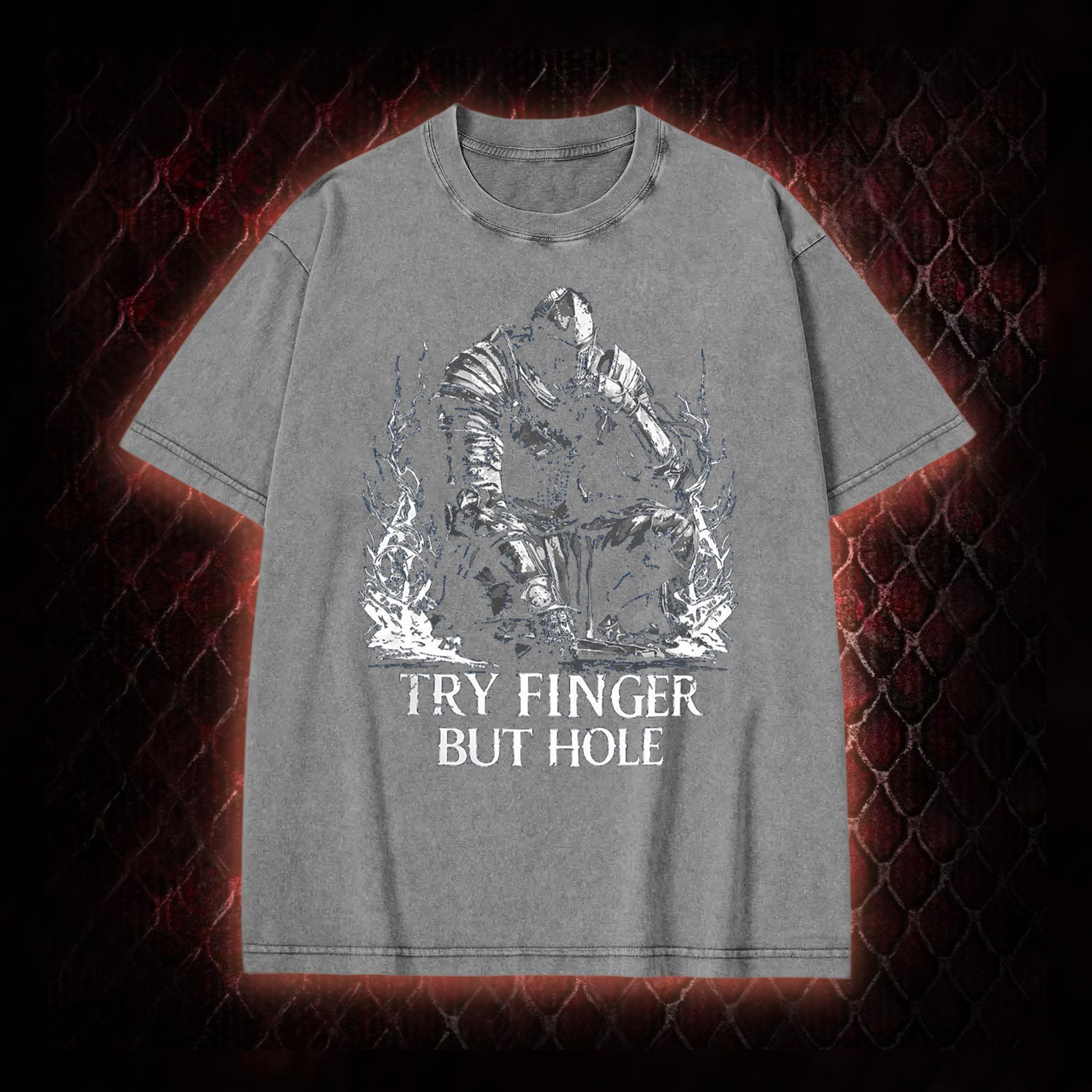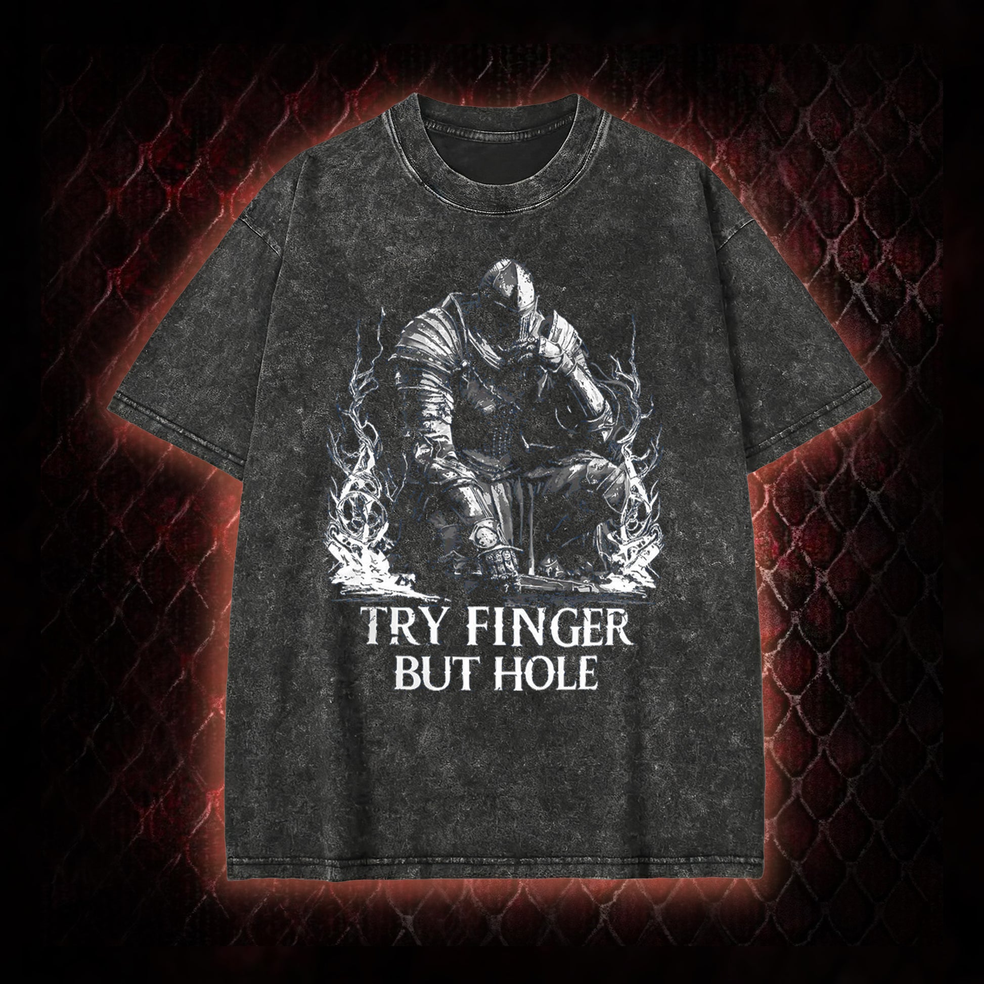 The graphic features a knight figure (aligned with Elden Ring's armored character aesthetic) paired with the viral fan-favorite line 'TRY FINGER BUT HOLE'¡ªa humorous reference to the game's NPC Fia's iconic interaction option (a playful, intentionally awkward phrasing that became a staple meme in the Elden Ring community). This design caters to fans of the game's quirky lore and player humor.