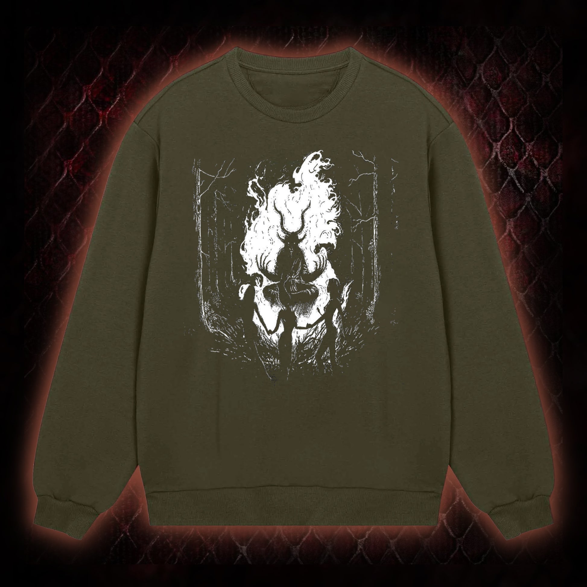 Featuring a bold black-and-white gothic forest ritual pattern (including a flaming central figure, silhouetted human forms, and barren tree motifs), the design aligns with dark culture aesthetics¡ªappealing to gothic, horror, and alternative style enthusiasts.