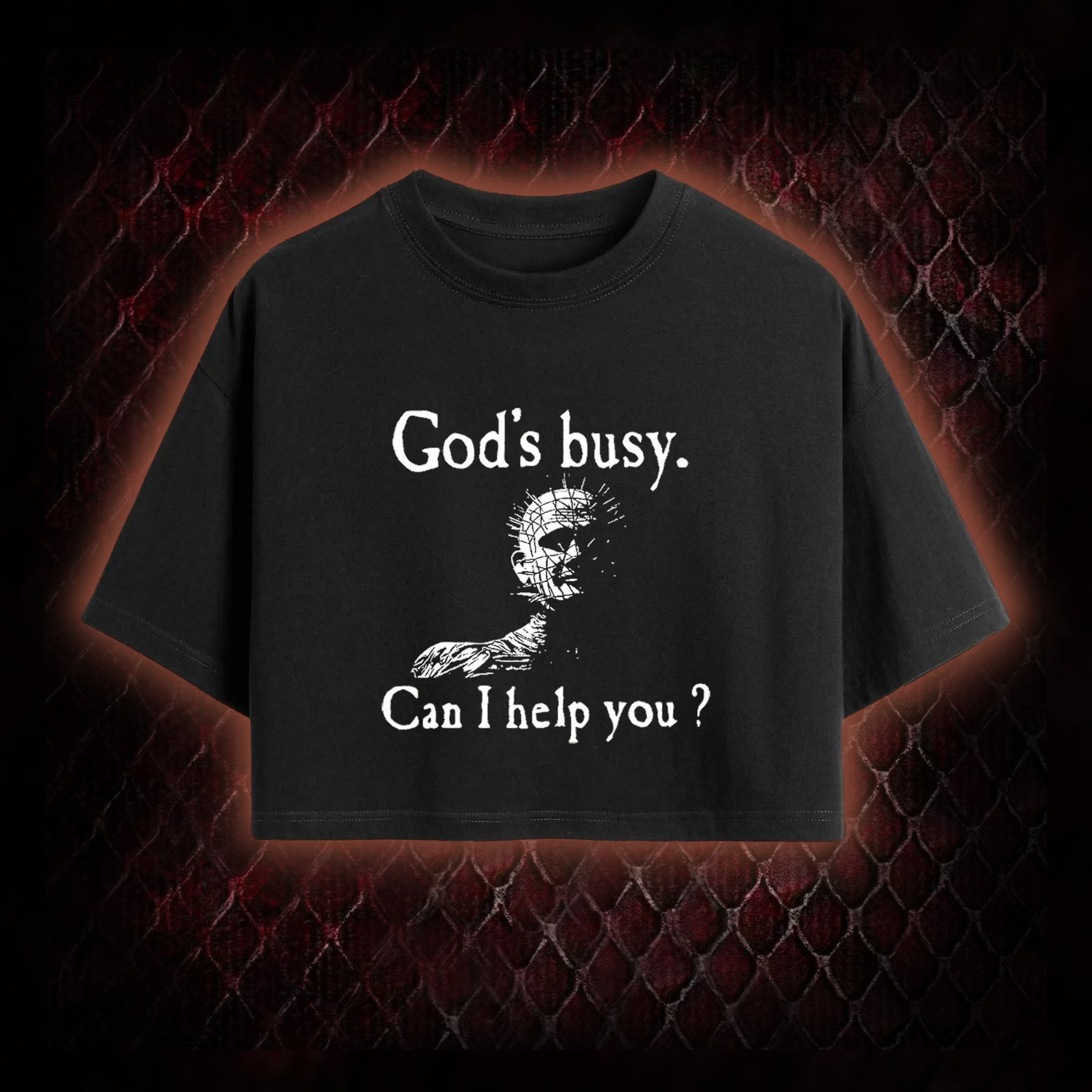 Hellraiser Pinhead 'God's Busy. Can I Help You?' Graphic Cropped T-shirt - Cult Horror Dark Humor Statement Piece