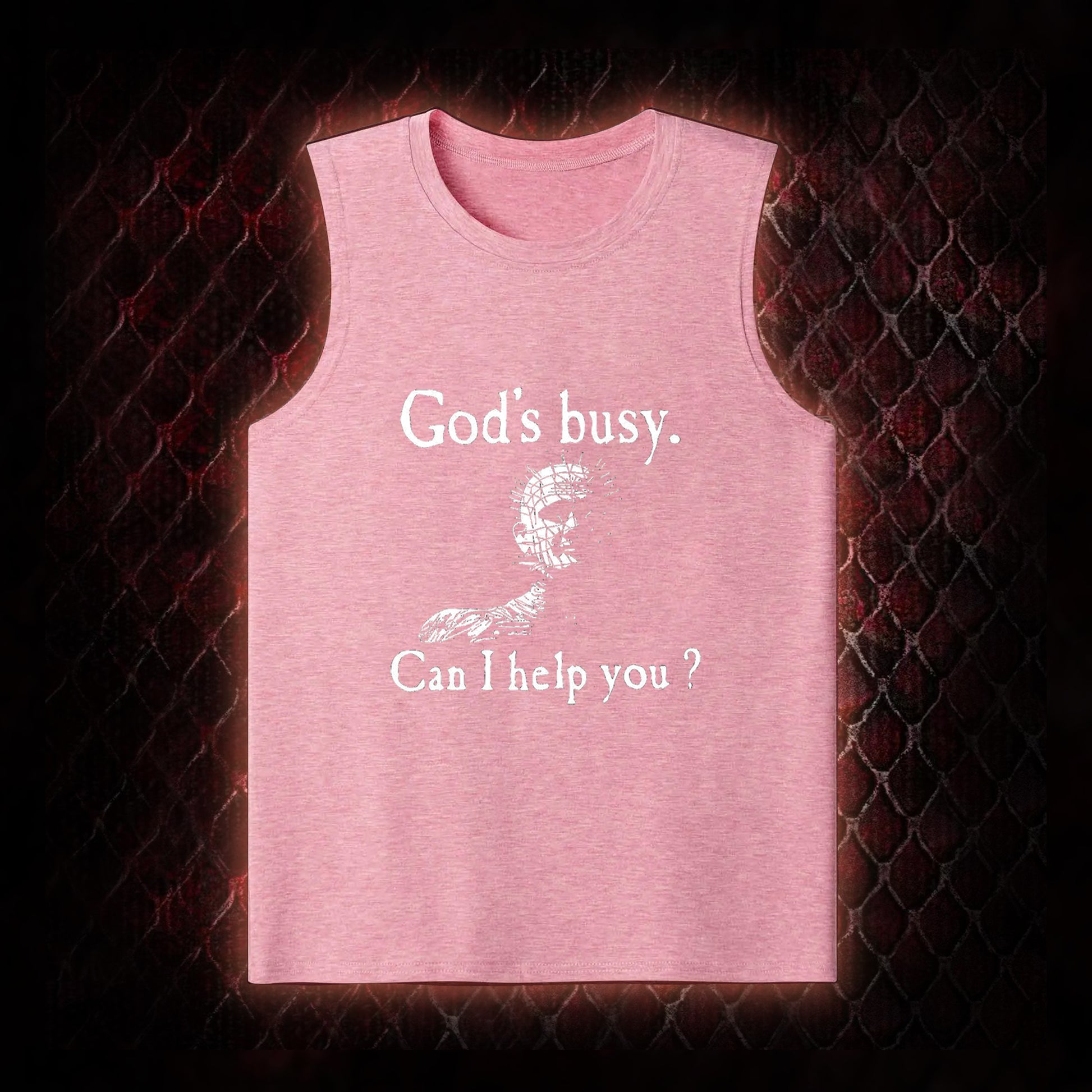 Hellraiser Pinhead 'God's Busy. Can I Help You?' Graphic Classic-Tank - Cult Horror Dark Humor Statement Piece