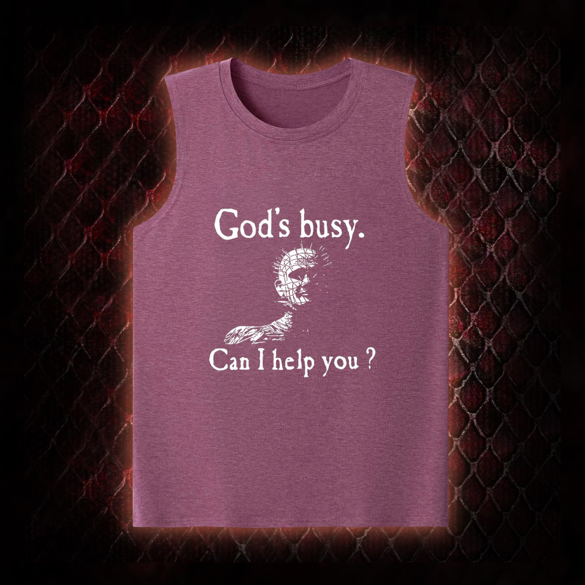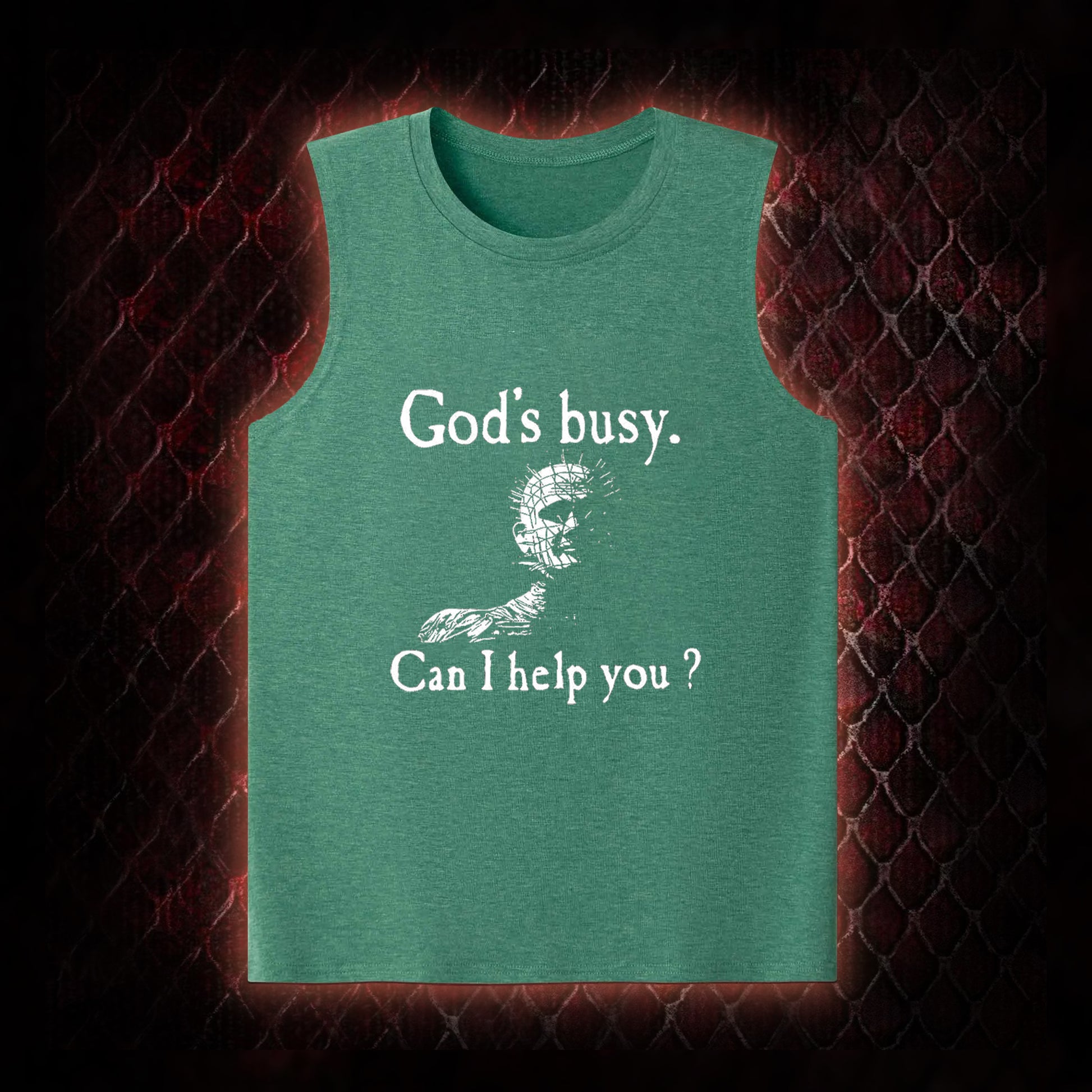 Hellraiser Pinhead 'God's Busy. Can I Help You?' Graphic Shirt Classic-Tank - Cult Horror Dark Humor Statement Piece