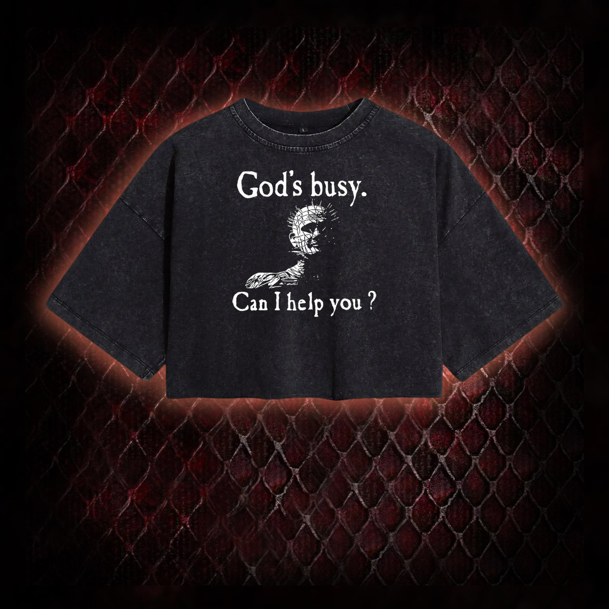 Hellraiser Pinhead 'God's Busy. Can I Help You?' Graphic Vintage-Cropped T-shirt - Cult Horror Dark Humor Statement Piece