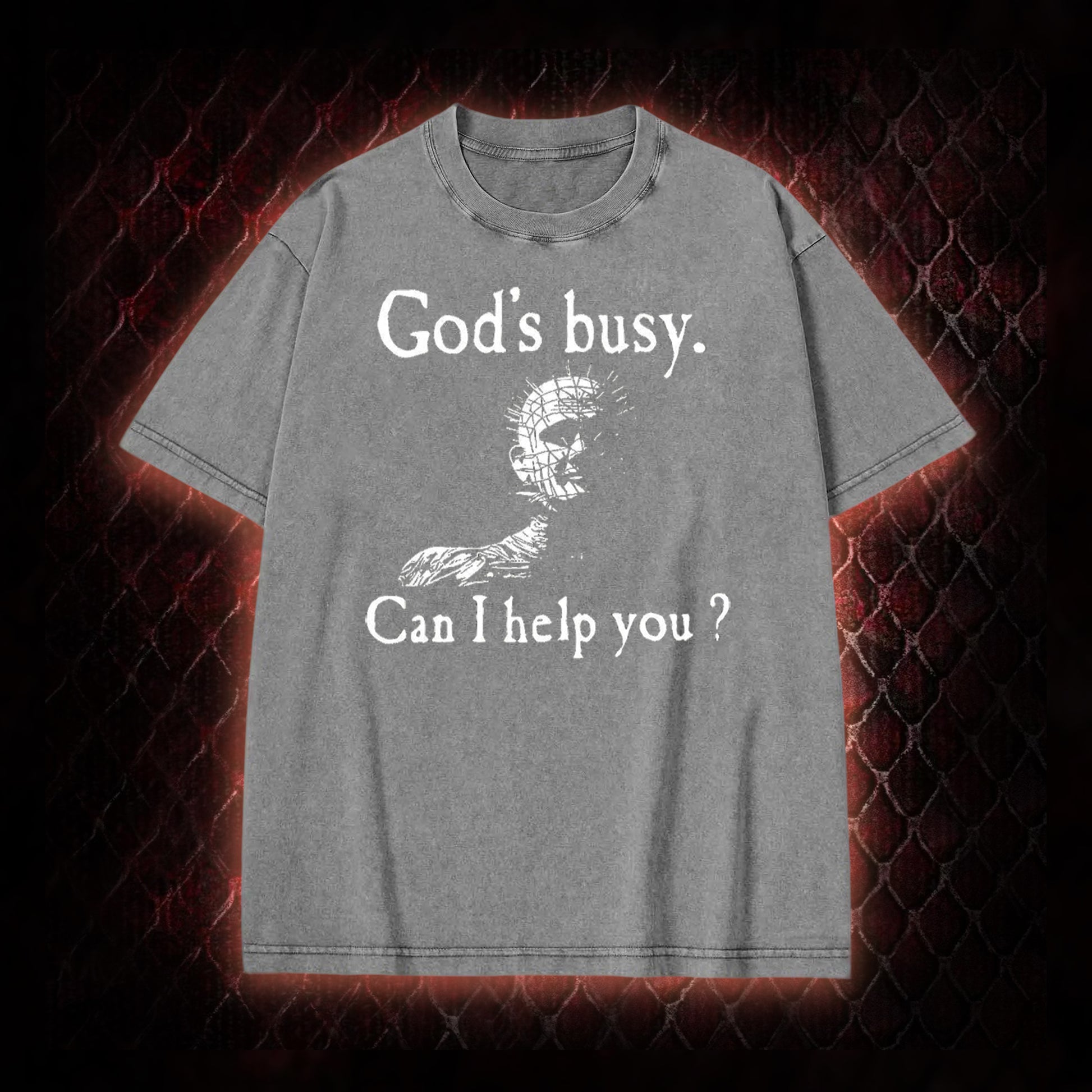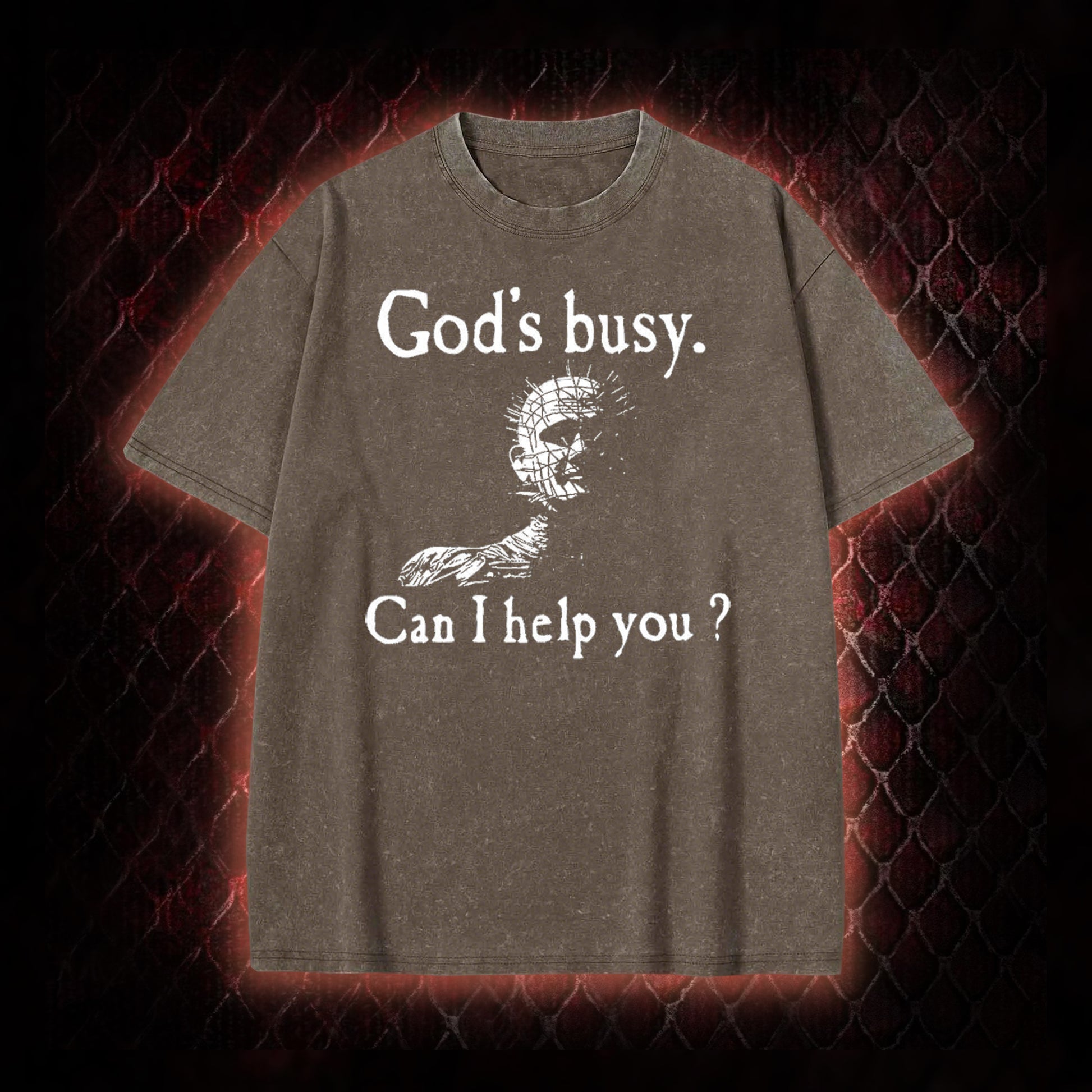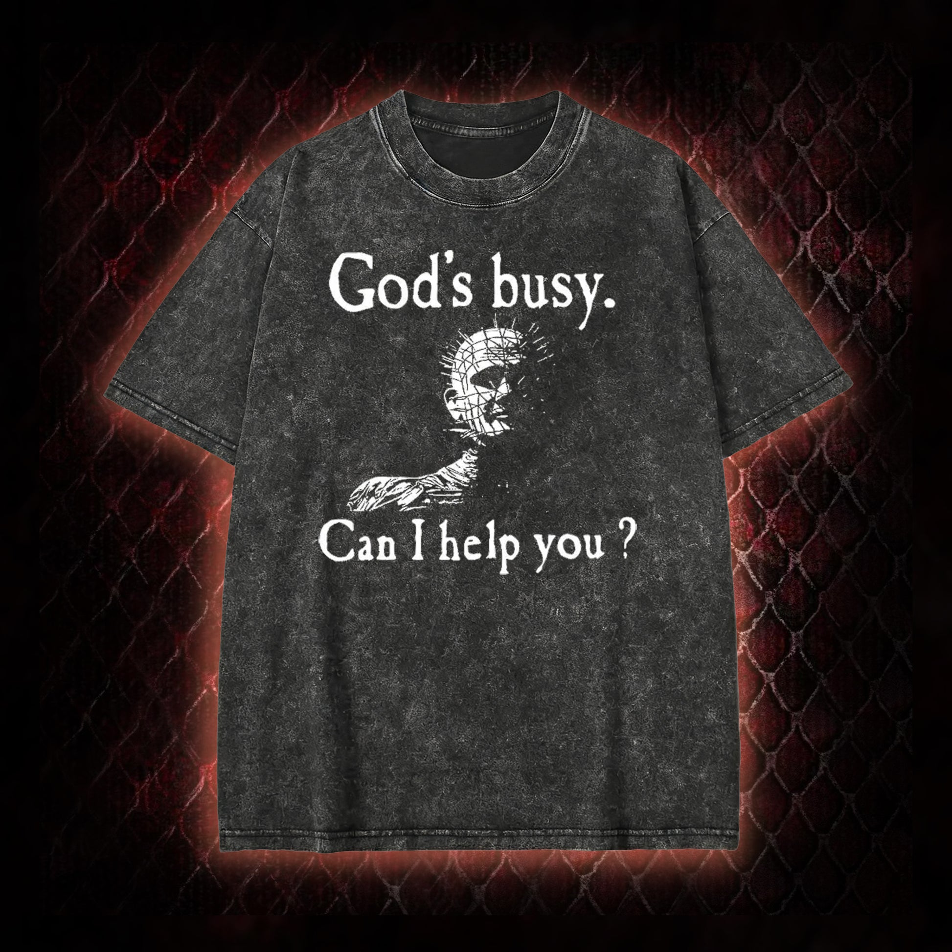 Hellraiser Pinhead 'God's Busy. Can I Help You?' Graphic Shirt Vintage-T-Shirt - Cult Horror Dark Humor Statement Piece