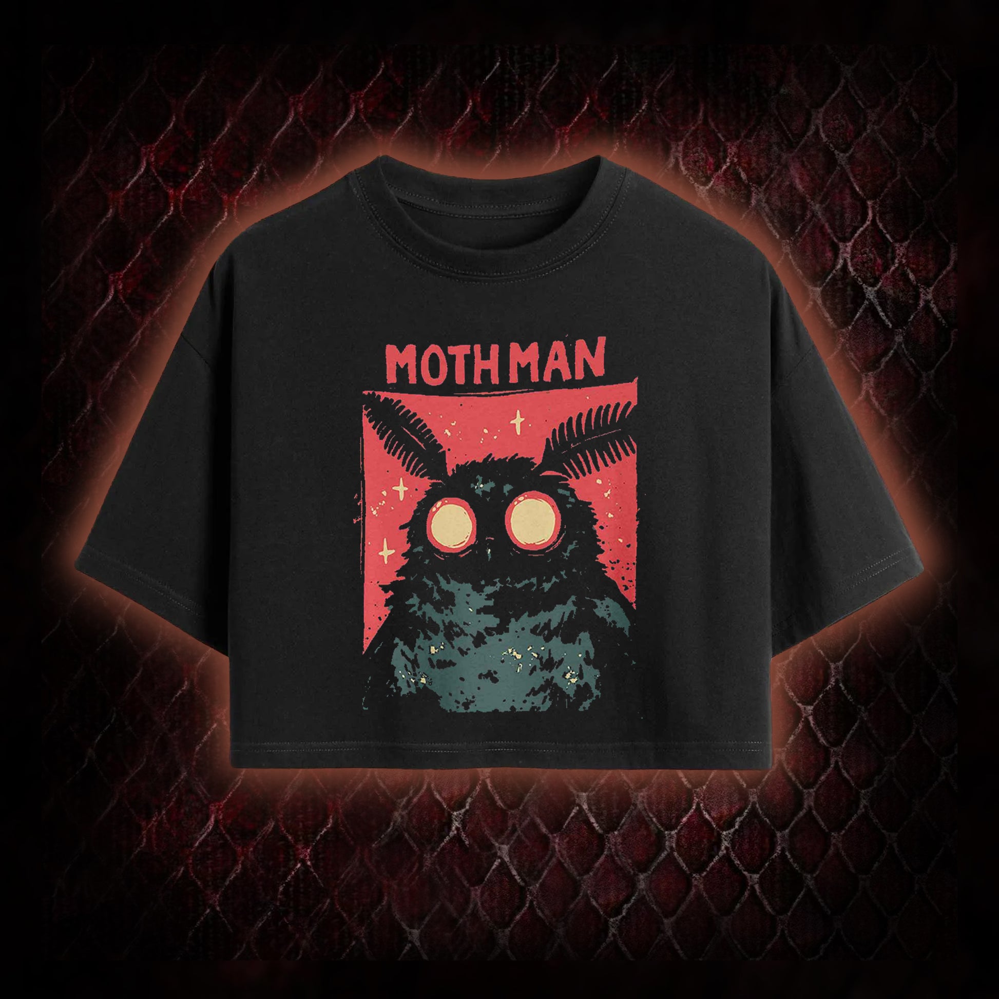 The design features a vividly printed Mothman with glowing red eyes, inspired by the famous 1960s Point Pleasant sightings in West Virginia. The cross-star background and dark aesthetic details meticulously reconstruct the classic legend elements, making the wearer a walking symbol of mysterious culture.