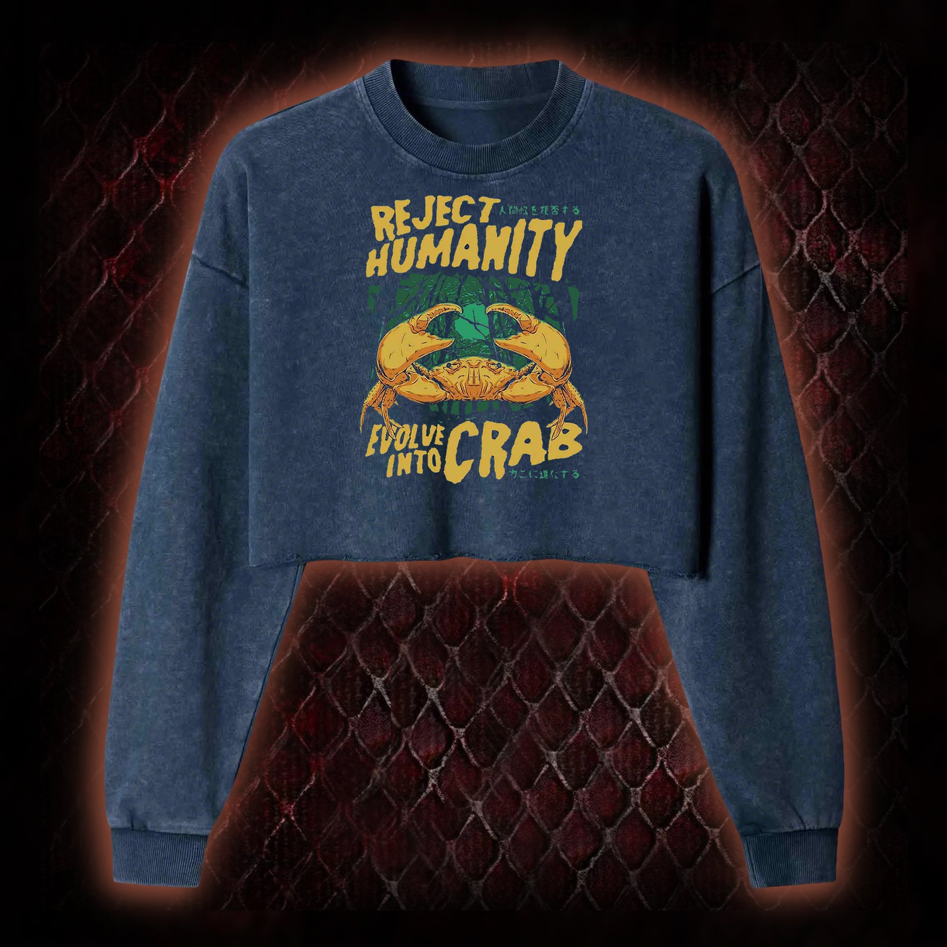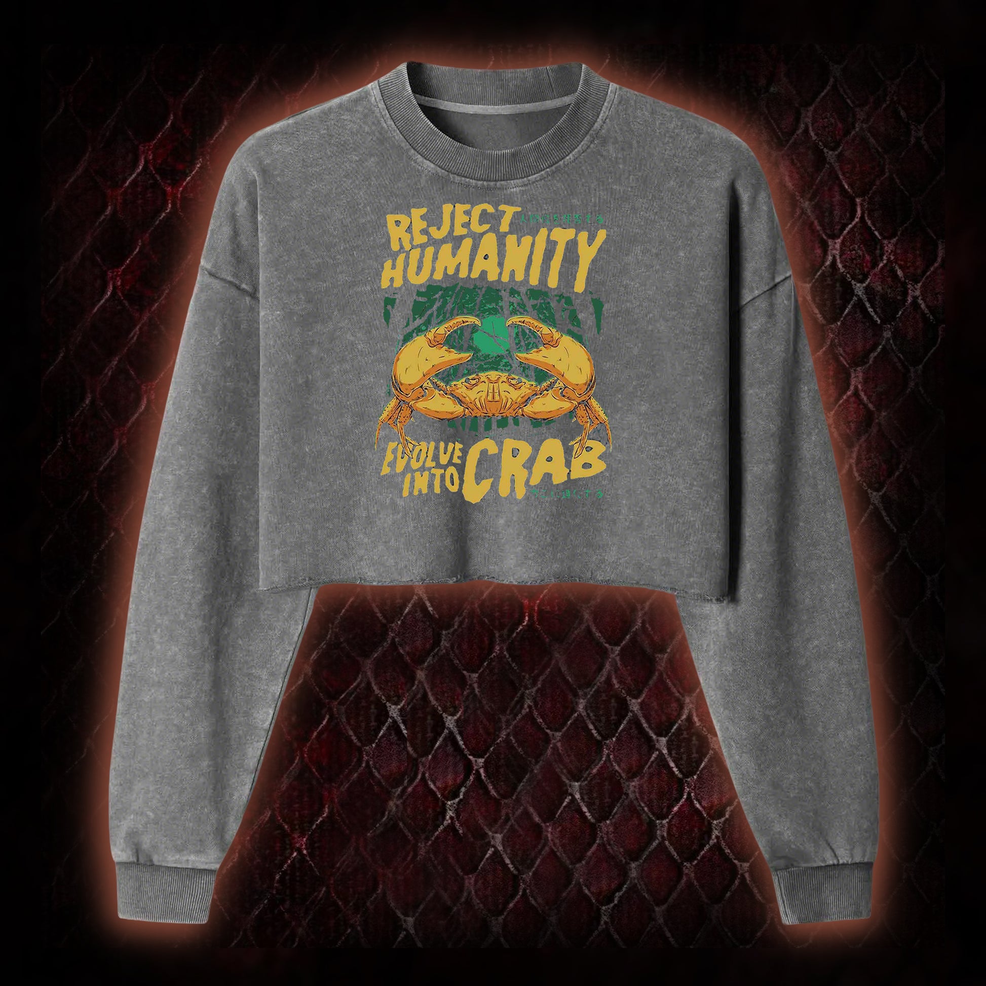 Reject Humanity Evolve Into Crab Meme Graphic Cropped Long-Sleeved - Viral Internet Humor Statement Piece