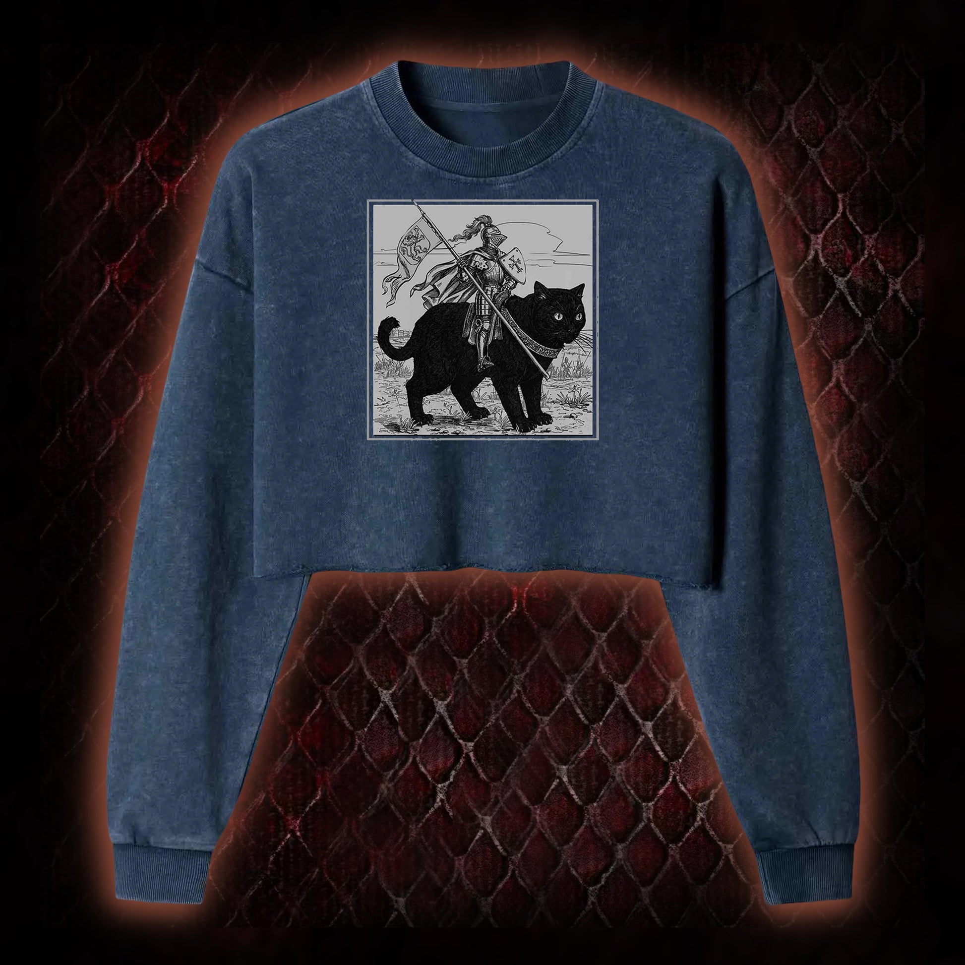 Vintage Knight & Giant Black Cat Medieval Fantasy Graphic Cropped Long-Sleeved - Whimsical Retro Aesthetic Statement Piece