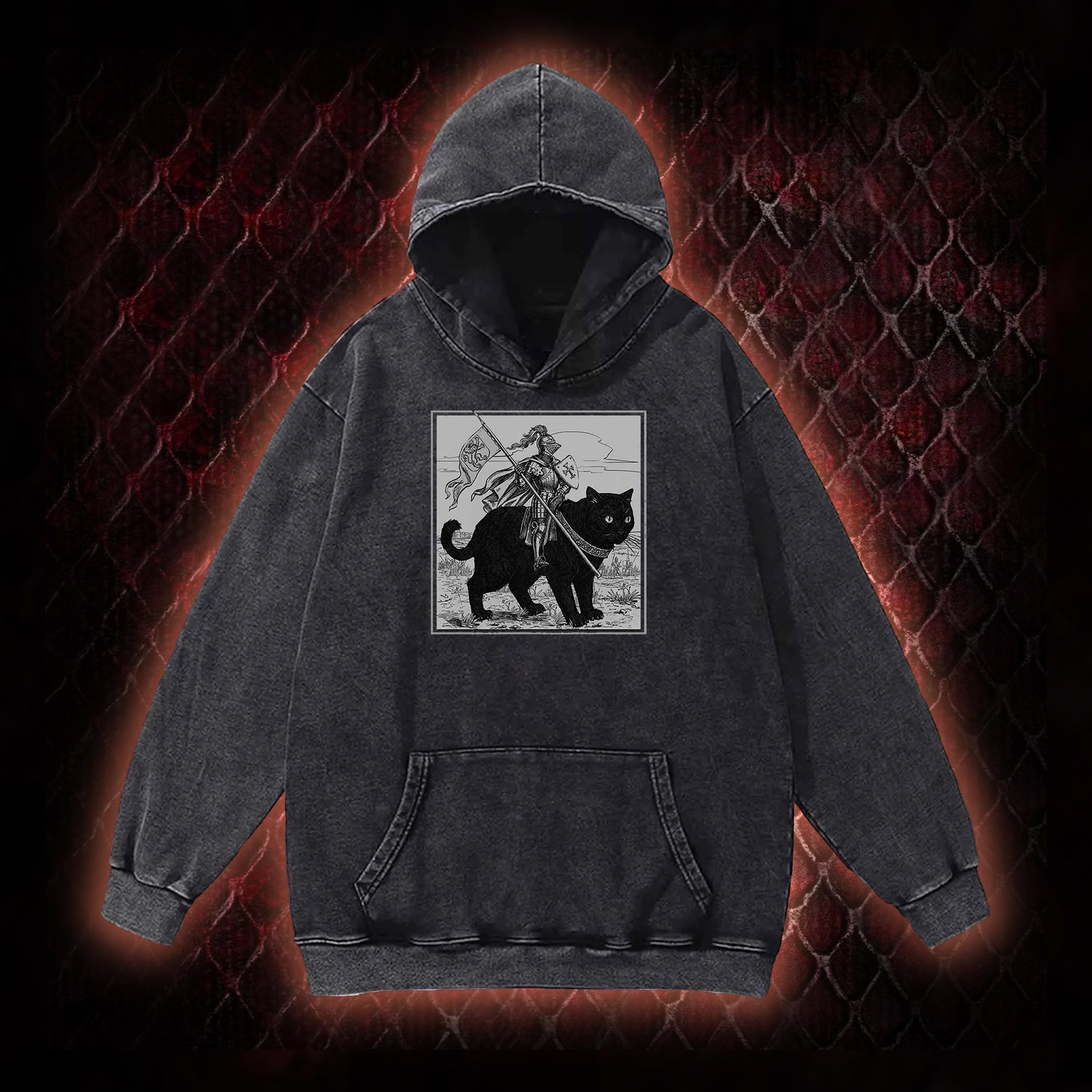 Vintage Knight & Giant Black Cat Medieval Fantasy Graphic Vintage-Hoodie - Whimsical Retro Aesthetic Statement Piece