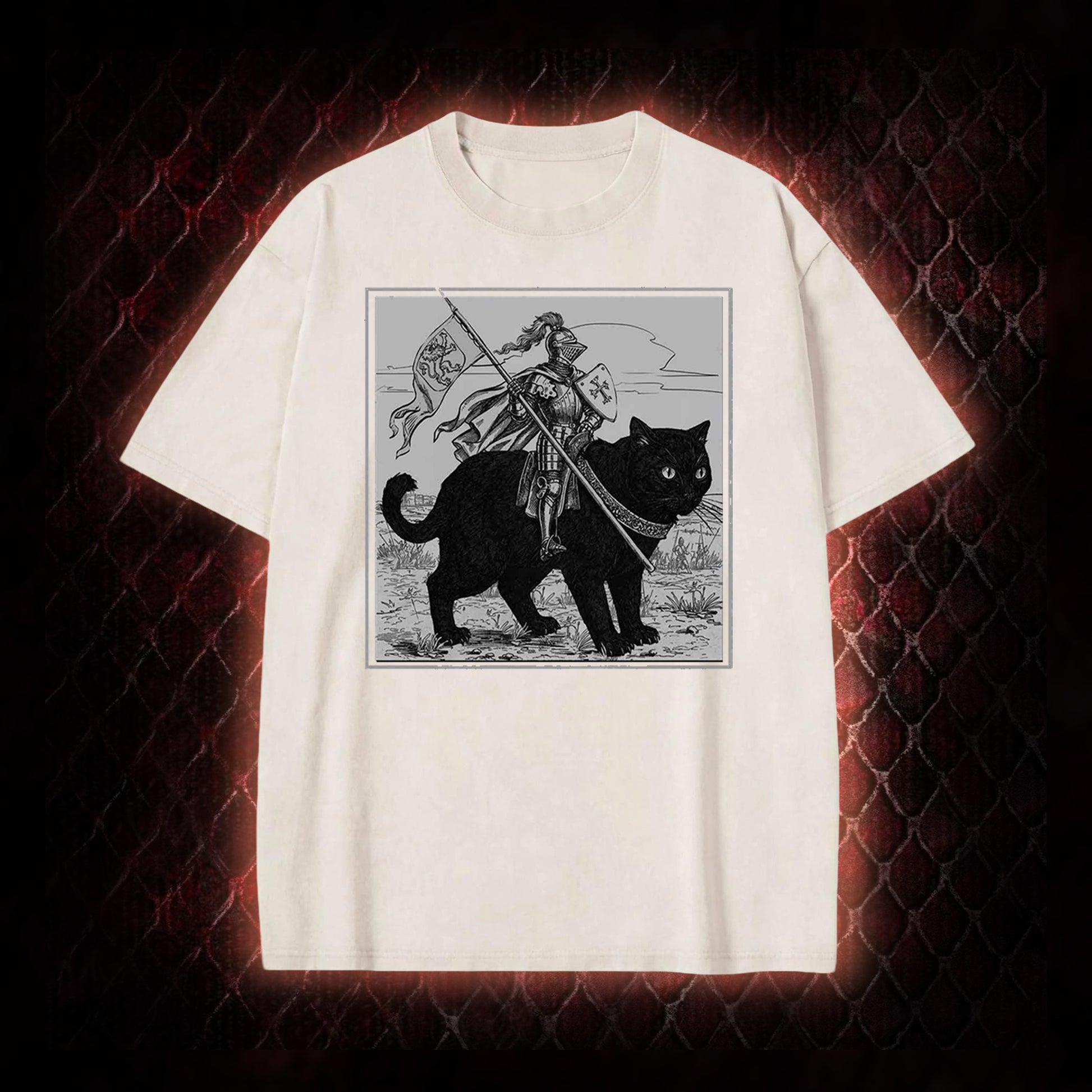 The pattern features a vintage-illustrated medieval knight mounted on a giant black cat¡ªblending Vintage chivalric imagery with whimsical, subversive fantasy elements. This retro art style aligns with niche medieval fantasy and quirky retro aesthetics, appealing to fans of offbeat fantasy themes and vintage illustration.