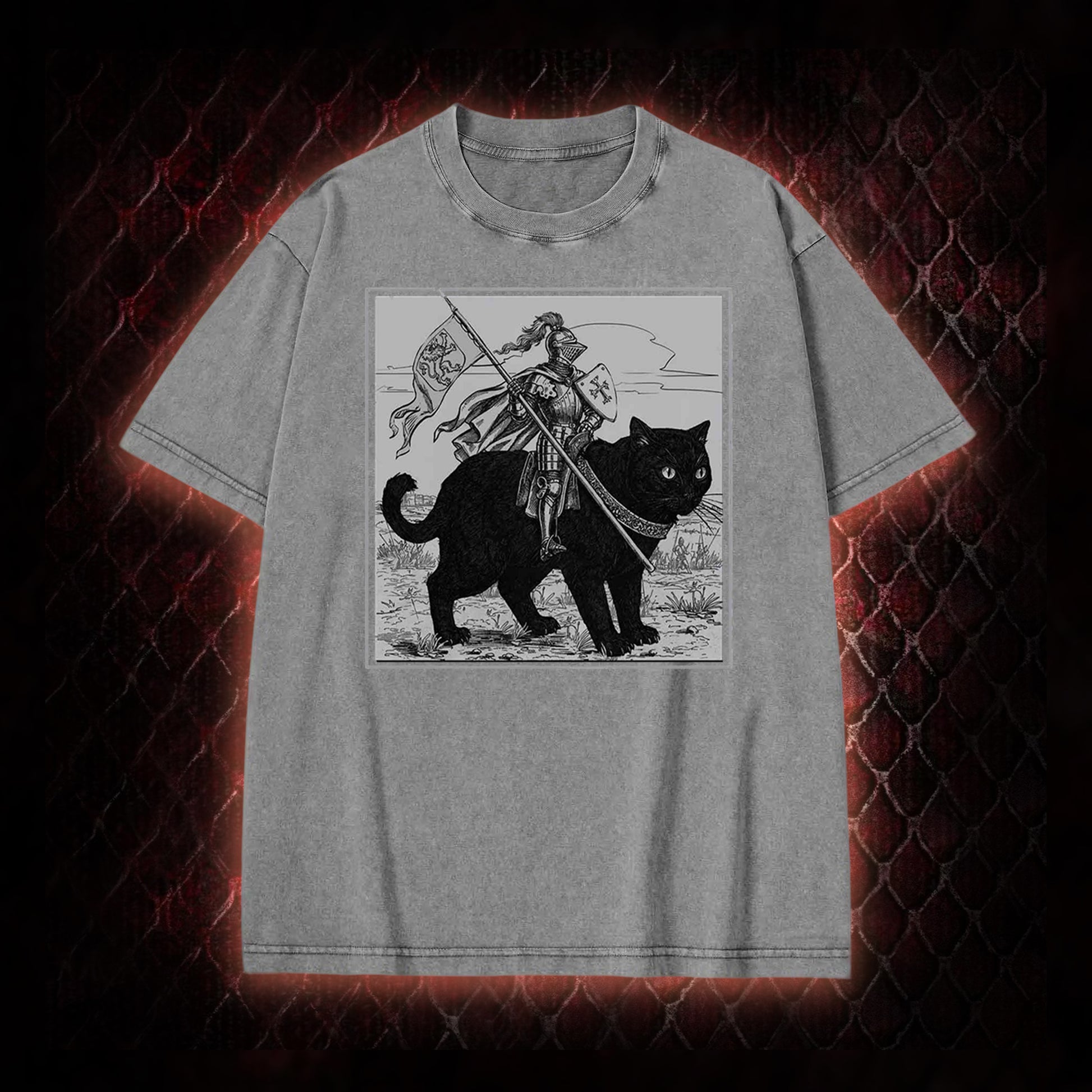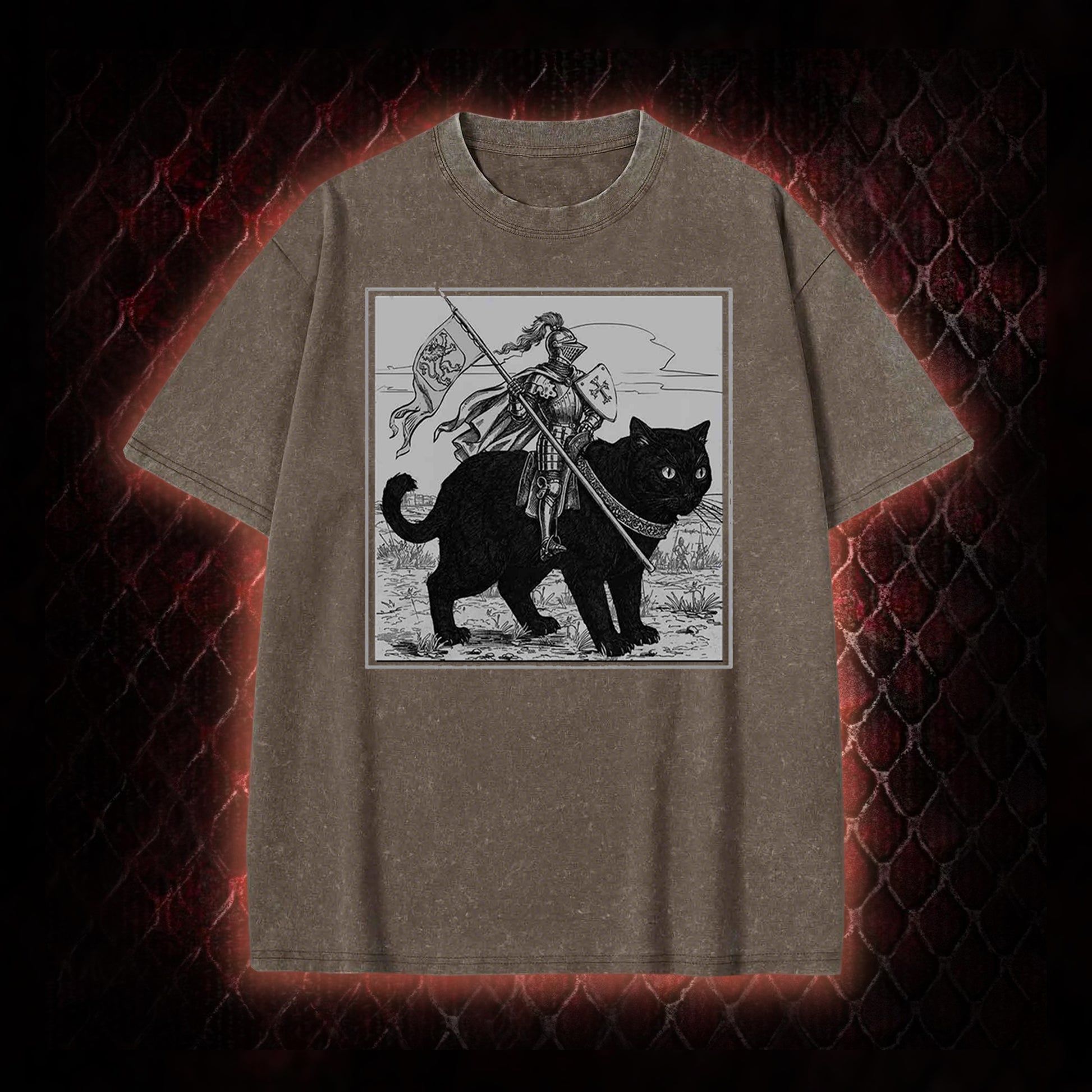 Vintage Knight & Giant Black Cat Medieval Fantasy Graphic Shirt Vintage-T-Shirt - Whimsical Retro Aesthetic Statement Piece